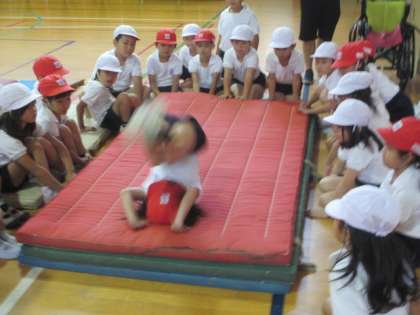 前転も、少し高くなると、何となく怖さも増して、自分の力が十分に発揮することができなくなるものです。