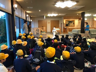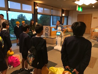 開舎式です。きちんとした態度でお話を聞いています。ペッパーくんがいろいろと宿舎のことを案内してくれました。