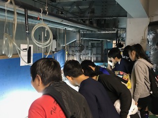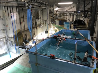 志摩マリンランドの水族館のバックヤードに入らせてもらいました。そこでエサやり体験をしています。ものすごい勢いでたべるさかなたちにびっくりしている子どもたちでした。