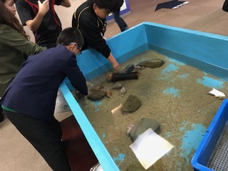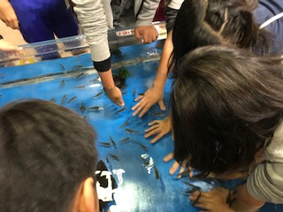 ふれあいタッチング水槽では、ドクターフィッシュやサカナをさわることのできる場所があります。子どもたちは楽しんでいます。