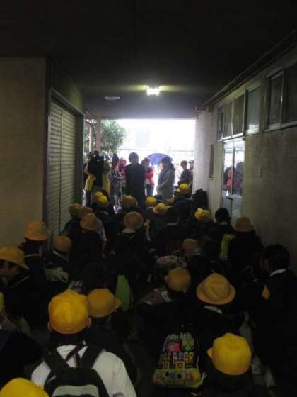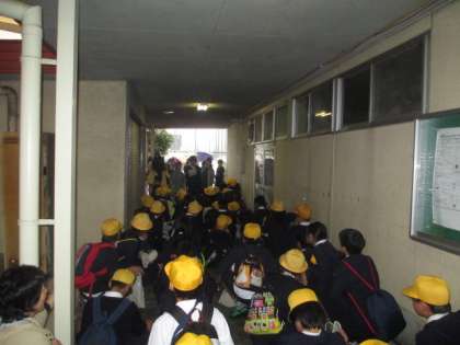 ちょっと疲れているような顔の人もいましたが、たくさんの保護者の方に迎えられて、バスから、学校の中に入りました。
