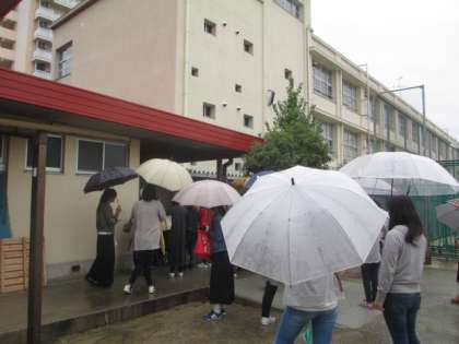 雨が降っていたため、運動場での帰校式を行うことができず、給食室前で行いました。