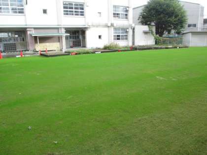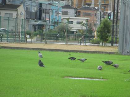 学校東側の芝生、朝は、やはり、ハトが集まって、種を食べているようでしょう。