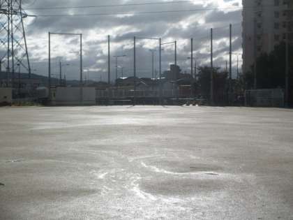 運動場は、水たまりがいっぱい。外で遊べるのは、昼からになるでしょう。
