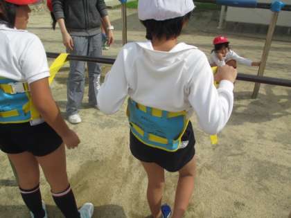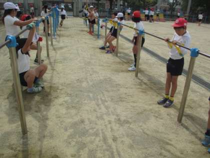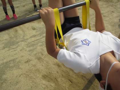 逆上がりができるように、練習用の器具を使って取り組んでいます。