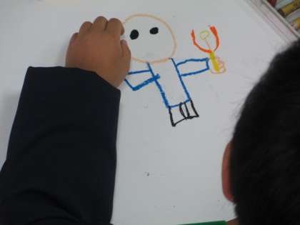学習発表会の様子を思い出しながら、パスを使って描いています。