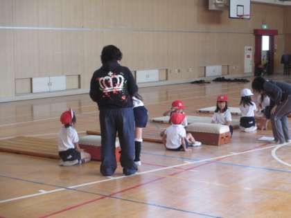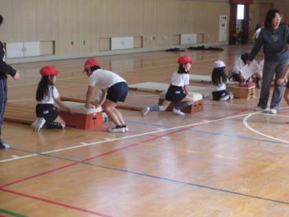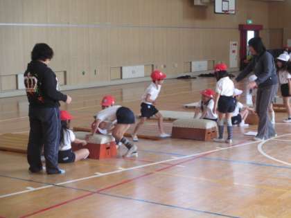 マットでは、前まわりができても、跳び箱の上では恐怖心が勝って、体が思い通りに動かなくなります。思い切りよく、ジャンプすると、思いのほかうまく回れるます。