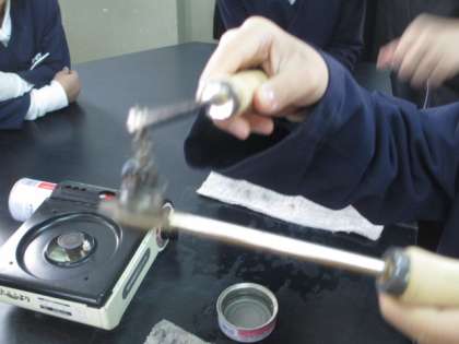 実験用コンロで鉄球をネッスルと、鉄の輪に通らなくなります。