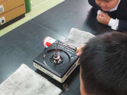 硬そうに見える金属も熱すると体積が増えるかを実験しています。
