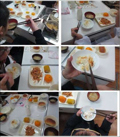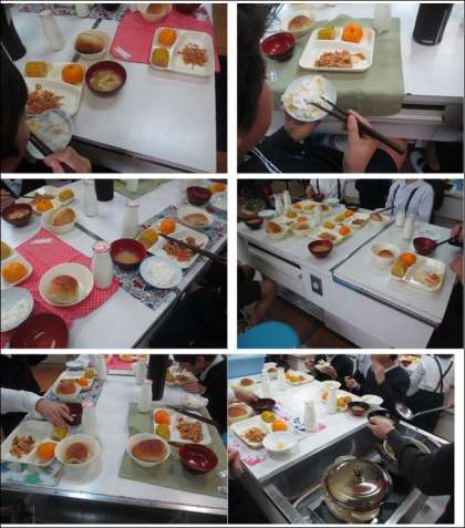 4時間目に、炊飯とみそ汁づくりを終え、給食の配膳が終了し、いよいよ、
