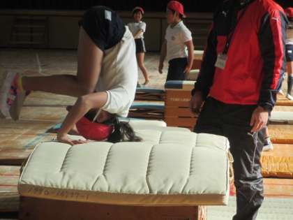 開脚跳び越しだけではなく、台上前転も挑戦しています。