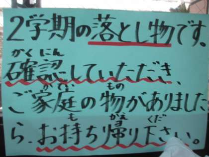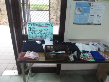 写真掲示とともに、2学期の落とし物を玄関入口においています。