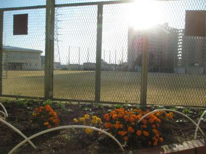 バックネット裏の花壇の花も寒い中しっかり成長しています。