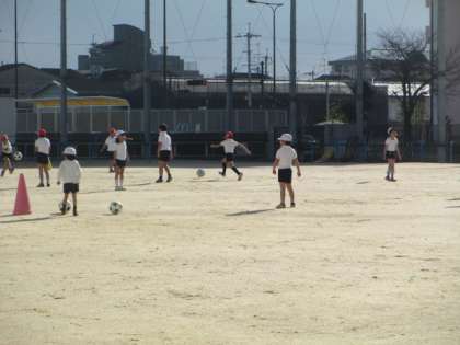 晴れていますが、冷たい風の中、ボールを追いかけて、運動場を走り回っていました。