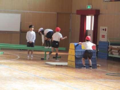 平均台 跳び箱、マット、フラフープなどを使い、チームで回っていきます。