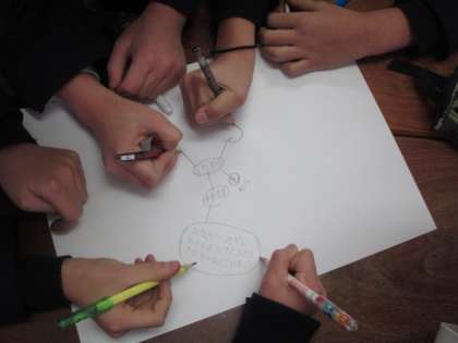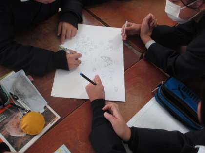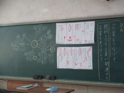 一つの言葉から連想される言葉を班で相談しながら考えていきます。