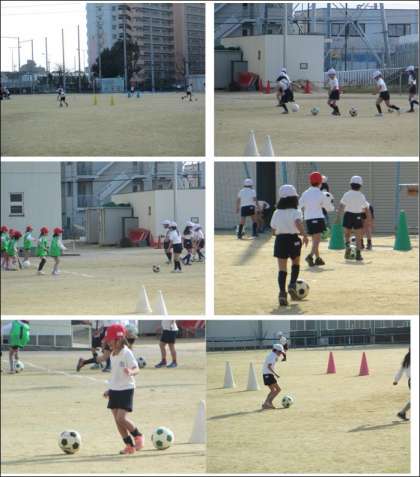 寒い中、ドリブルの練習をしたり、簡単なゲームをしたりしてサッカーに親しみました。