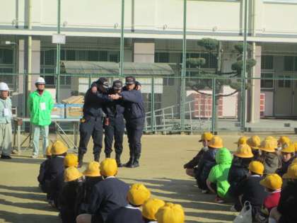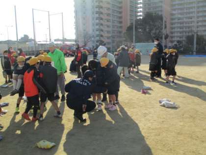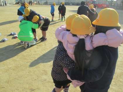 消防署や地域防災リーダーの方の指導を得て、二人で一人を運ぶ方法を教えていただきました。正しい方法でしないと、救助される側だけではなく、救助している側がけがをすることにもなります。