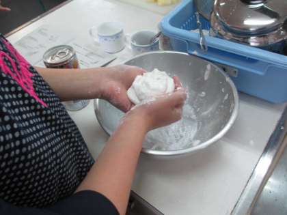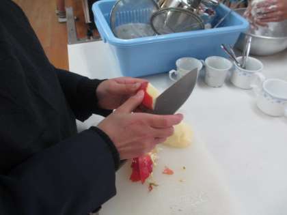 白玉団子を作るのに、水の加減を失敗したり、リンゴの皮をむくのに、必要以上に分厚く向くもの一興。日々、繰り返し練習することで上手になります。