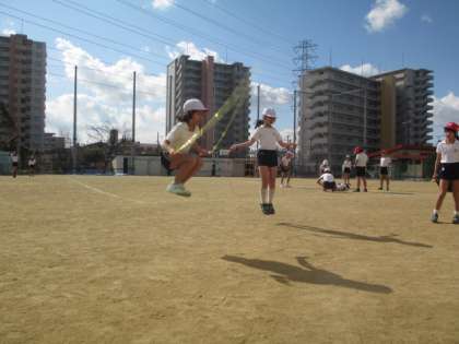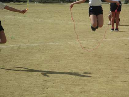 春めいた日差しが降り注いではいますが、冷たい風も吹く中、元気よくなわとびをしている4年生。