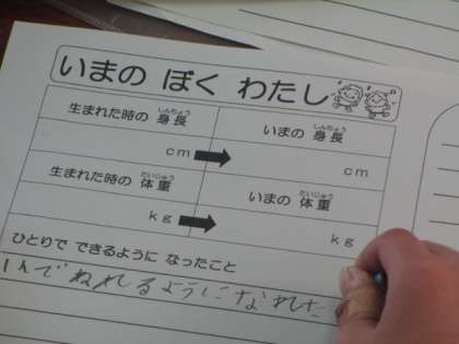 小さいころの写真やおうちの方たちに書いていただいた資料を基に、いろいろなことができるようになった今の自分について記述しています。
