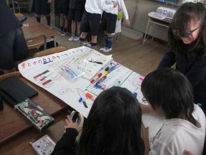 班で協力しながら、壁新聞の制作に取り組んでいます。