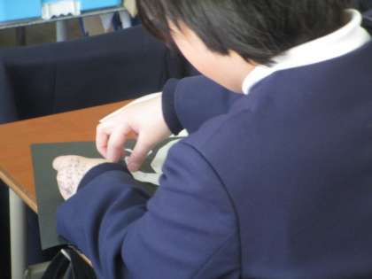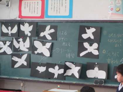 真っ黒な画用紙に、鳥を貼っています。