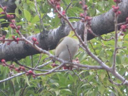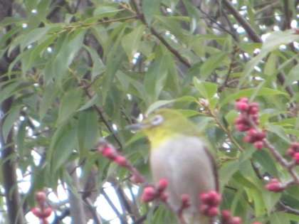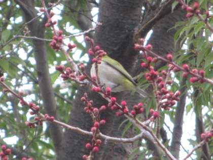 講堂前の池の梅の木には、まだ花は咲いていませんが、つぼみが少しずつ膨らんできました。そこに、うぐいすが2羽。