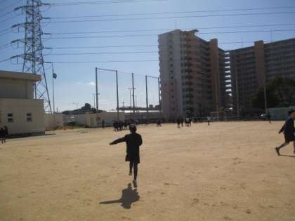 気温はそれほど上がっていませんが、春の明るい日光の中で、元気よく運動場で遊んでいます。