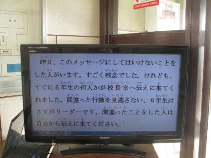 昨日は、校長先生のメッセージのいたずらに気が付いた6年生が、すぐに、校長先生に報告してくれました。気の付いた「おかしなこと」をしっかりと判断していく力が大切になっていきます。