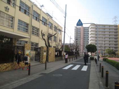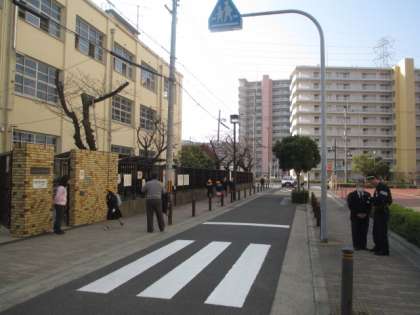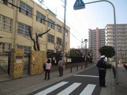 学校前の一方通行の道路の入り口側には、パトカーを停めていただき、おまわりさんに、子どもたちの安全を見守っていただいています。