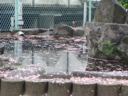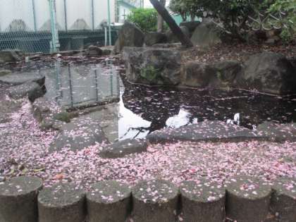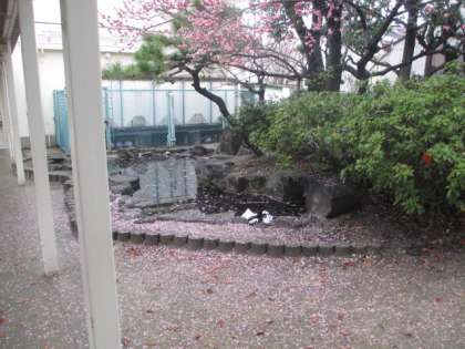 満開になっていた講堂前の池の梅も、雨風のために花びらが散り始めています。