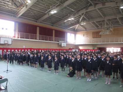 卒業式の時に在校生代表として参加し、卒業生とともにしっかりと校歌を歌った5年生が全校をリードし、今年度最後の斉唱をしました。