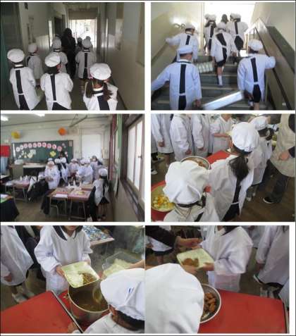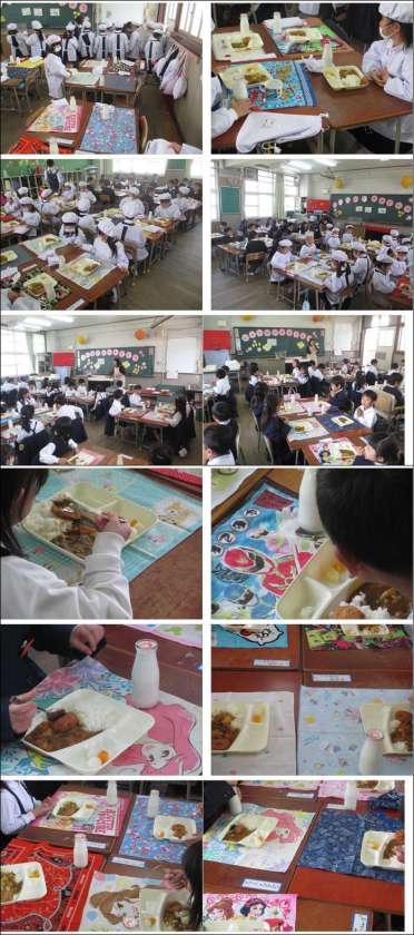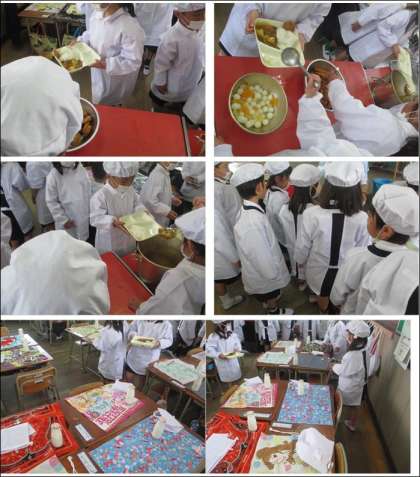1年生のみなさんも、自分で食缶や牛乳、食器を取りに行き、自分たちで配膳をしました。今日は、入学お祝い献立。