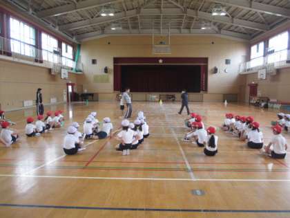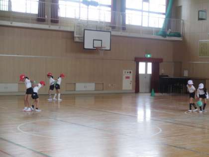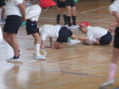 ボール運びをしています。2人が後ろ向きになって、腰のあたりにボールをはさみ、運んでいきます。進む方向を向いていればスピードを上げることができますが、後ろ向きになってしまうと、前向きに進んでいる速さについていけずに、こけてしまっているチームもありました。自分のチームを応援したり、頑張っている子どもに声援を送ったりし、楽しく学習を進めることができました。