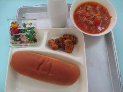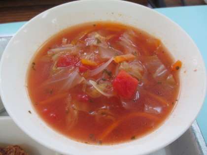 ミネストローネには、鶏肉・キャベツ・たまねぎ・トマト・にんじん・にんにく・パセリが入っていました。とても具沢山なスープで、とてもおいしかったです。
