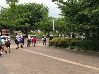 長居公園に着きました。お天気は曇りです。みんな元気に歩いています。