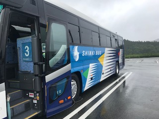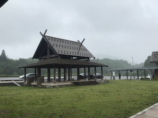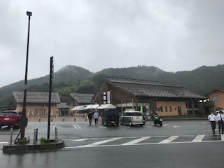 5年生で実施をする林間学習の下見に来ています。今の場所は道の駅まほろばです。行きのトイレ休憩地に予定しているところです。今日は、少し雨が降っています。