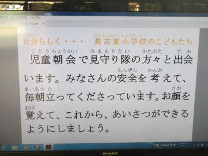 今日の児童朝会では、登校の時にお世話になっている方との顔合わせの会を行いました。