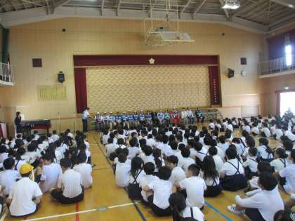 児童代表の感謝の言葉の後、講堂から退場していただくときには、全校で、拍手で見送りました。
