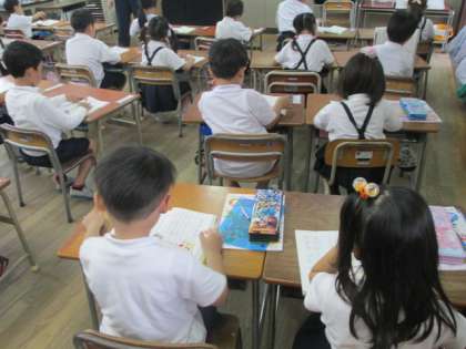 先生の範読に合わせて、一行ずつ読んでいきます。