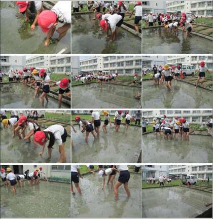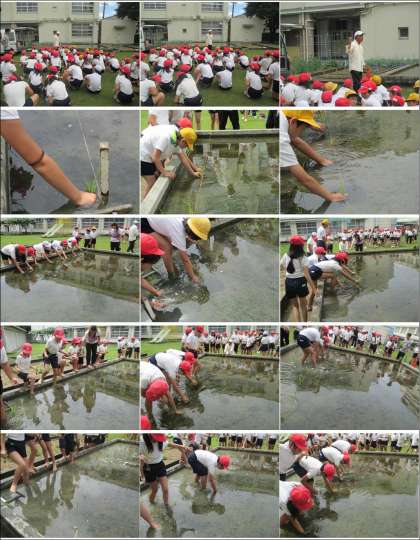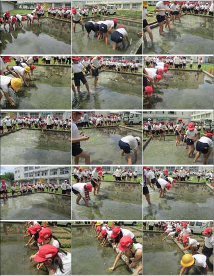 苗の根元を持って、しっかりと水田に差し込むように植えていきます。