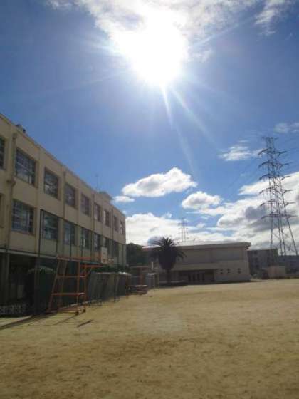 お日様の姿がしっかりと学校の朝の校庭に差し込んできています。