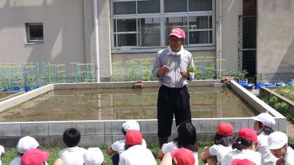 地域の松島さんに来校していただき、田植えについて教えていただきました。初めての田植えの経験。田んぼの中に入りました。