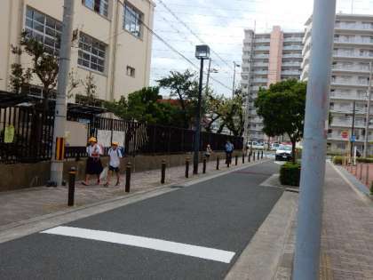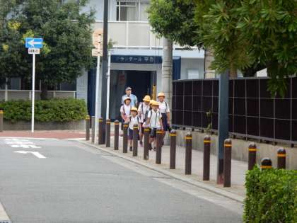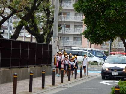 今日も平野警察より、おまわりさんが2名子どもたちの登校を見守りに来校していただきました。