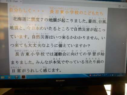と残しましたが、今年は、忘れる間もなく、天災が日本列島を襲ってきているようです。火曜日の台風の復旧が十分でない昨日は、北海道で初めての震度7の地震で大きな被害が出ました。天災を阻止したり、事前に予測したりすることは不可能ですが、天災に遭った時の被害をできるだけ少なくすることは可能です。地震や洪水、高潮、暴風雨など、ご家庭でも、事前に災害が生じた時の行動については十分に話し合っていただければと思います。