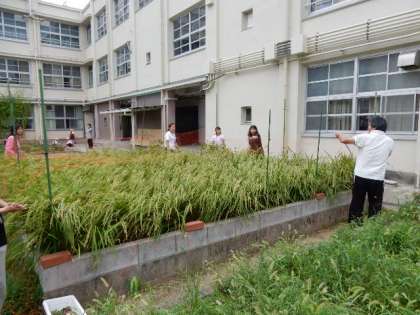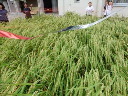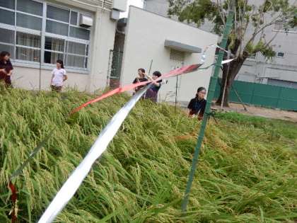 この時期になると、長吉東の水田に防鳥ネットをはります。