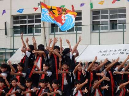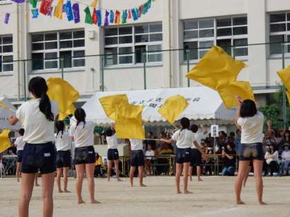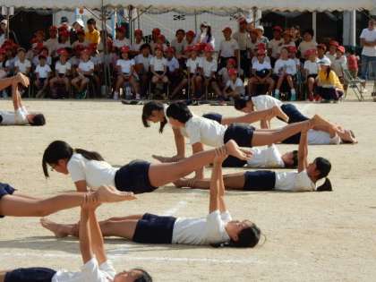 ブリッジなど力試しの運動があり、フラッグを使った動きがあり、最後はソーラン節を見事に演技しきりました。全員の心がつながるすばらしい演技でした。