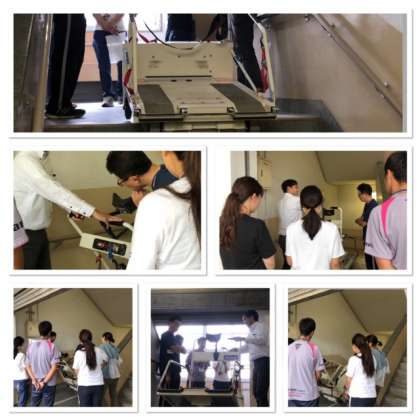 昇降機の研修会を行いました。昇降機とは、車いすで階段を上り下りする機械のことです。研修を受けないと使うことはできません。熱心に研修を受けました。そして、合格することができ、これから昇降機を使えるようになりました。