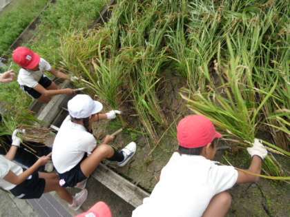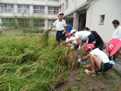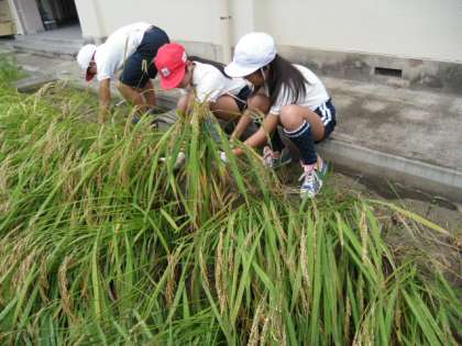 1学期には、田植えを行いました。今年は、高温が続いたり、台風が来たりして、例年に比べて生育が悪かったようです。どれだけ収穫出来がでしょう。